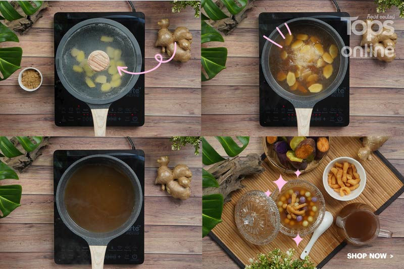 4. มาถึงขั้นตอนการปรุงน้ำขิง โดยเริ่มต้นที่ตั้งเตาไฟ ปรับไฟให้อยู่ในระดับปานกลาง นำขิงและน้ำเทลงใส่หม้อผสมกันจนน้ำเริ่มเปลี่ยนเป็นสีน้ำตาลอ่อน จากนั้นเติมน้ำตาลทรายแดงเพื่อปรุงรสหวานตามชอบ แล้วปิดไฟ จากนั้นตักบัวลอยใส่ถ้วยที่เตรียมไว้ ราดด้วยน้ำขิง และโรยปาท่องโก๋ทอดกินแกล้มกัน พร้อมเสิร์ฟให้คุณรับประทานร้อนๆ เลยค่ะ