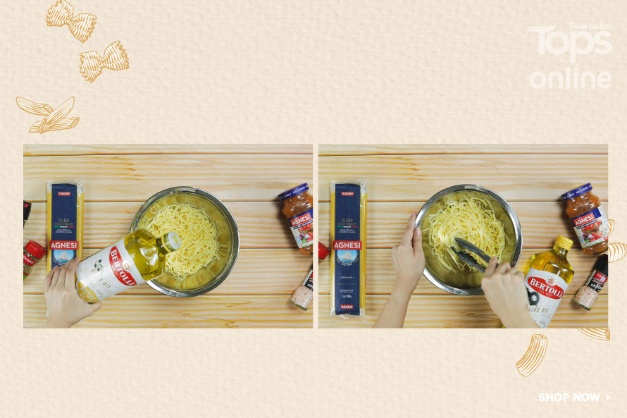 2. คลุกเคล้าเส้นแองเจิลแฮร์ด้วยน้ำมันมะกอกเล็กน้อยเพื่อป้องกันไม่ให้เส้นติดกัน