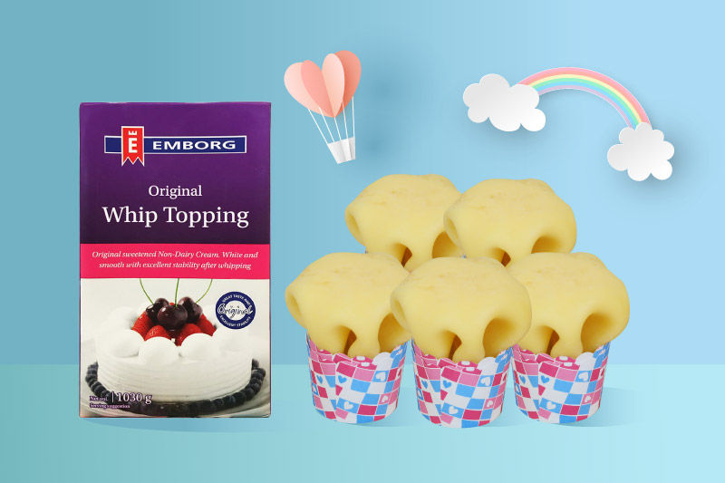 Whipped cream is made from a whipping cream whipped by a whisk until it’s light and fluffy. At first, a whipping cream will become dense and when you keep whipping it, it will finally turn light and fluffy. You can add sugar for an extra sweetness and add artificial odor for a luring smell. Now you get a sweet fluffy topping for your cakes.