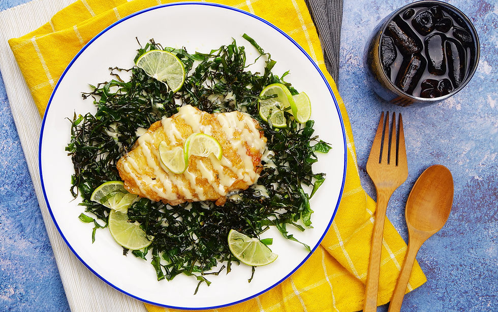 Serve the crispy chicken on the crispy kale and top with lime sauce.