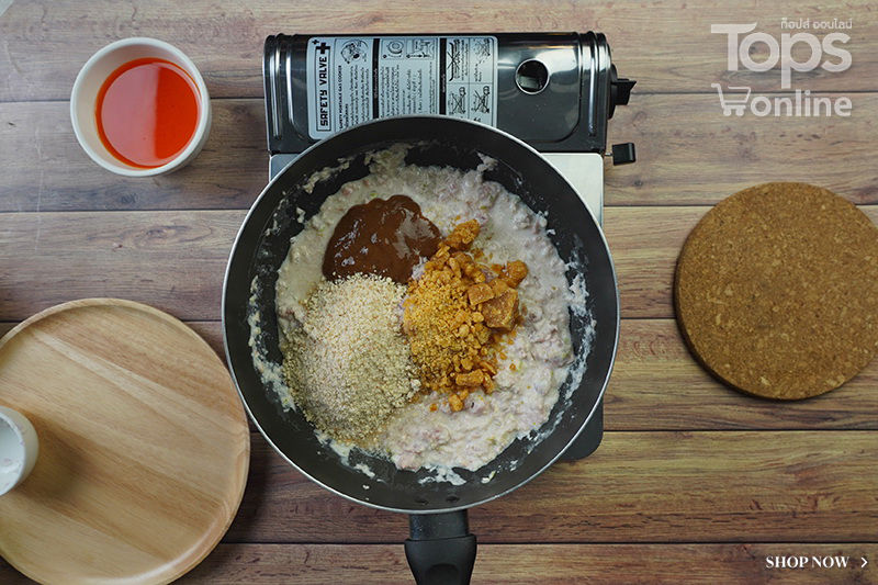 4.เทกะทิลงในหม้อ ใส่หมูสับที่คลุกไว้ลงไปคนให้เข้ากัน ตั้งไฟกลาง หมั่นคนจนเดือดและหมูสุก