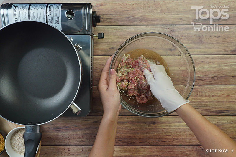 3. ตำรากผักชี กระเทียม พริกไทยให้ละเอียด แล้วนำไปคลุกกับหมูสับ