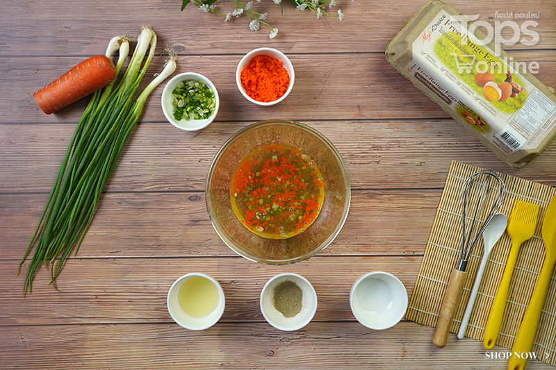 1.เทไข่ขาวลงไปในอ่างผสม ตามด้วยแครอทสับ กับต้นหอมซอย