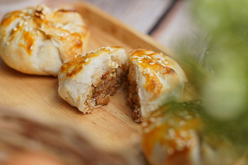 Place the dough with filling into baking tray, brush the top of each dough with egg yolk, and sprinkle with white sesame seeds. Bake in the oven at 230 c° for 10 minutes or until the pastry turns golden. Decorate by sprinkle sesame seeds on top of pastries.