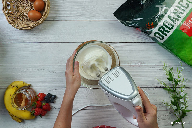 Such a unique ingredient as rice can be matched with anything and delivers a fantastic taste. Let’s explore how to creatively turn rice into a homemade style dessert which can easily be made in your own kitchen. With various health benefits, the key ingredient used for today’s special is My Choice organic jasmine rice where every rice seed is meticulously selected to ensure the best quality. Find all you need for “Jasmine Rice Pancake."