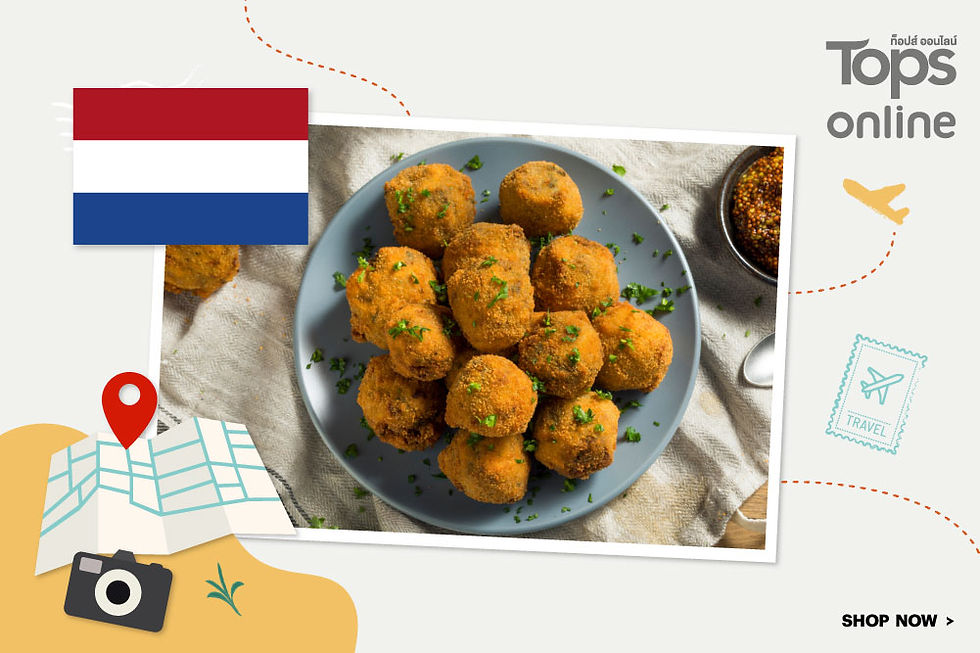 มีทบอลสไตล์ดัทช์ จากประเทศเนเธอร์แลนด์ ที่ทำมาจากเนื้อสับบดละเอียดปรุงรสเข้มข้นด้วยพริกไทย เกลือ ผักชีฝรั่ง และจันทน์เทศ คลุกเคล้าแป้งชุบเกล็ดขนมปังแล้วนำไปทอด พร้อมเสิร์ฟเป็นสแน็คทานเล่นระหว่างวัน ทานเดี่ยวๆ ก็อร่อย หรือจะทานแกล้มกับเบียร์ก็เข้ากันได้ดีอย่างลงตัวค่ะ