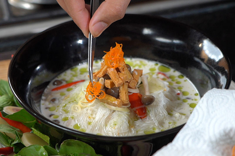 Dish up and garnish with fried tofu, chili peppers and a few drops of sweet basil oil. Make the dish more beautiful with colorful flowers and it is ready to be served.