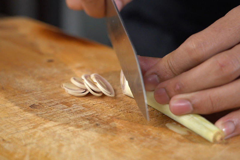 Slice galangal, lemongrass, chili peppers, Shimeji mushroom and set aside.