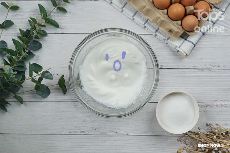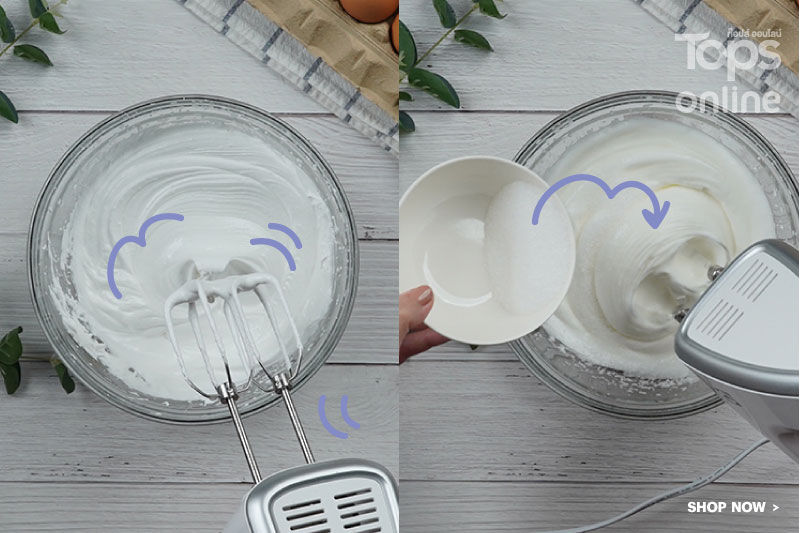 3. ค่อยๆ ใส่น้ำตาลลงไปตีด้วยความเร็วปานกลางจนน้ำตาลละลายหมด จากนั้นให้ตีไข่ขาวและส่วนผสมต่างๆ จนตั้งยอดแข็ง เงาและเหนียวกลายเป็นเมอแรงค์