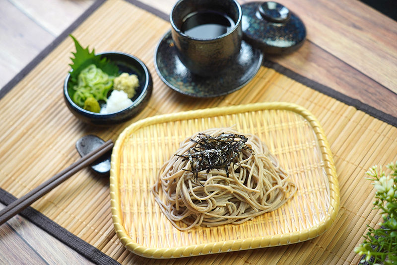 5.จัดเส้นโซบะที่เย็นแล้วใส่จานที่เตรียมไว้ โรยสาหร่ายให้สวยงาม เสิร์ฟพร้อม หัวไชเท้าบด ขิงบด ต้นหอมซอยและวาซาบิ